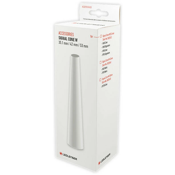 With the Signal Cone, safety and visibility always come first. The plastic plug-in attachment quickly transforms the Ledlenser flashlight into a versatile white signal light at any time, e.g. for use in road, rail and air traffic, in emergencies or in photography. Likewise, the flashlight can be transformed into an all-round light with the white attachment, for example, to evenly illuminate rooms or a tent.